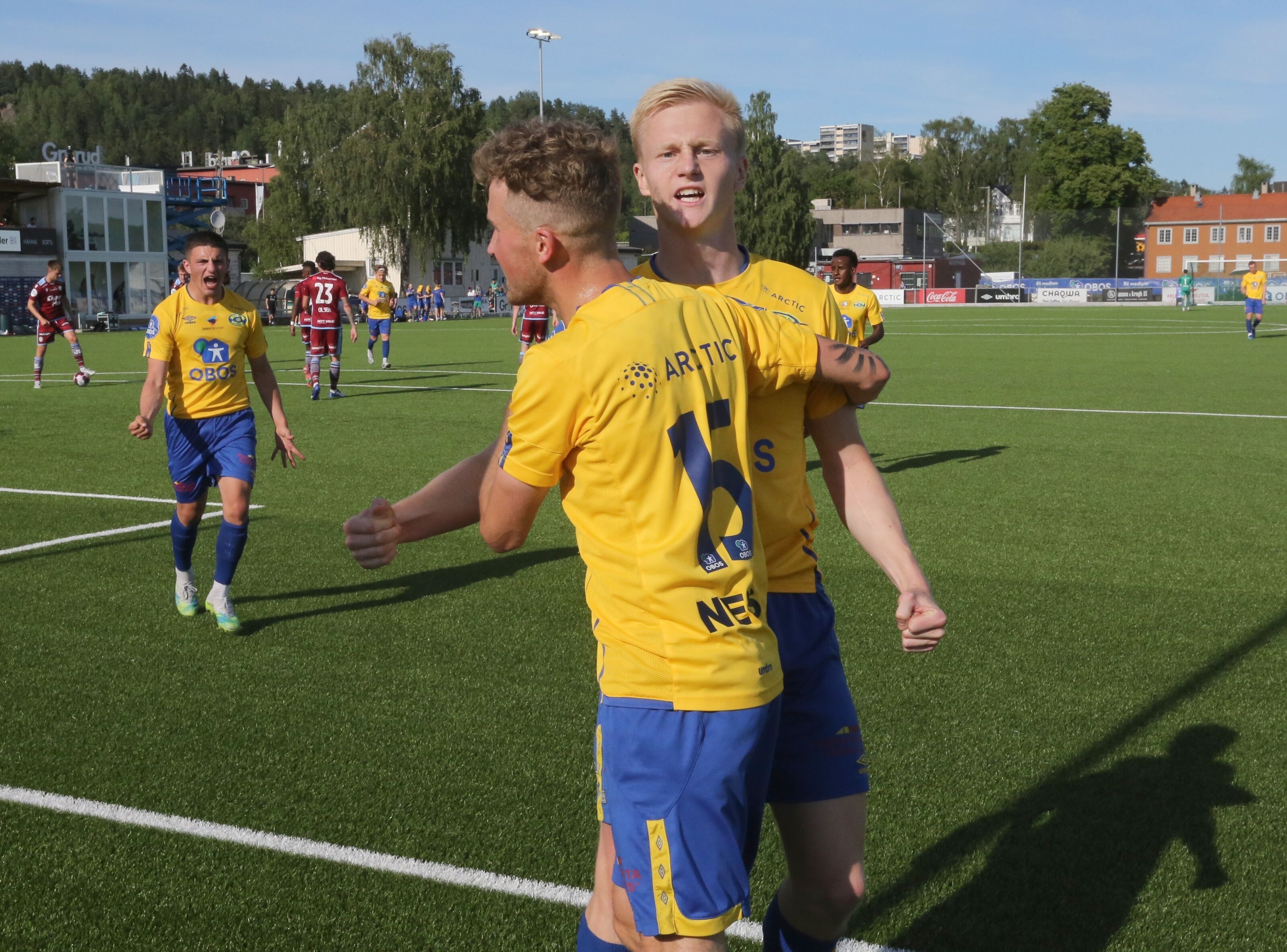DAGENS MANN: Oscar Aga omfavnes av Fabian Ness etter 1-0 på straffe. Foto: Rolf E. WulffBilde 1 av 3 For å se disse bildene må du ha et abonnement