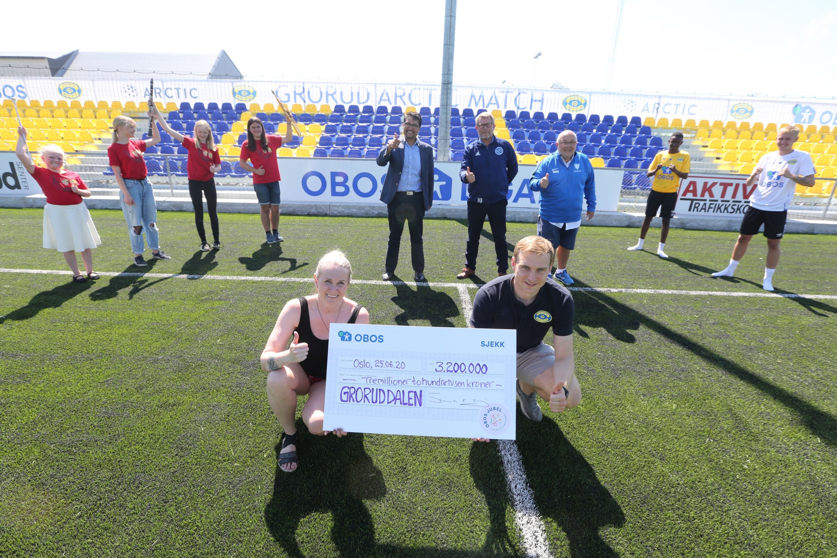 GLADE MOTTAKERE: Drillmamma Anett Reinholtsen i Grorud skoles musikkorps og daglig leder i Grorud IL, Jon Ole Reinhardsen, med den symbolske sjekken som viser totalsummen OBOS gir til Groruddalen - 3,2 millioner kroner. Bak står konsernsjef i OBOS, Daniel Kjørberg Siraj (f.v.), Håvard Braserudhaget fra Høybråten og Stovner IL og Vidar H. Noreng fra Furuset IL. Embla, Eskil, Maja og Cornelia fra musikkorpset, samt Grorud-spillerne Saadiq Faisal Elmi og Elias Kristoffersen Hagen er med på jubelen. Foto:Bilde 1 av 4