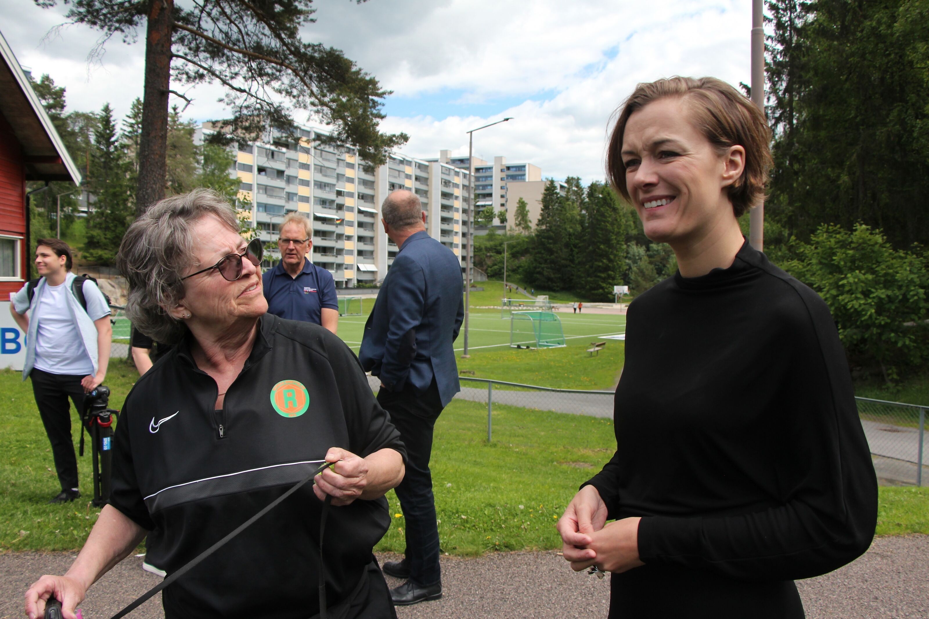 Kulturminister Anette Trettebergstuen (Ap) sier at regjeringen vil gi mer penger til bygging av nærmiljøanlegg i områder og bydeler med levekårsutfordringer. Det styrker nærmiljøene og forebygger ungdomskriminalitet. Her med leder Sissel Smeby i 50-års-jubilerende Romsås Idrettslag. Foto:Bilde 1 av 1