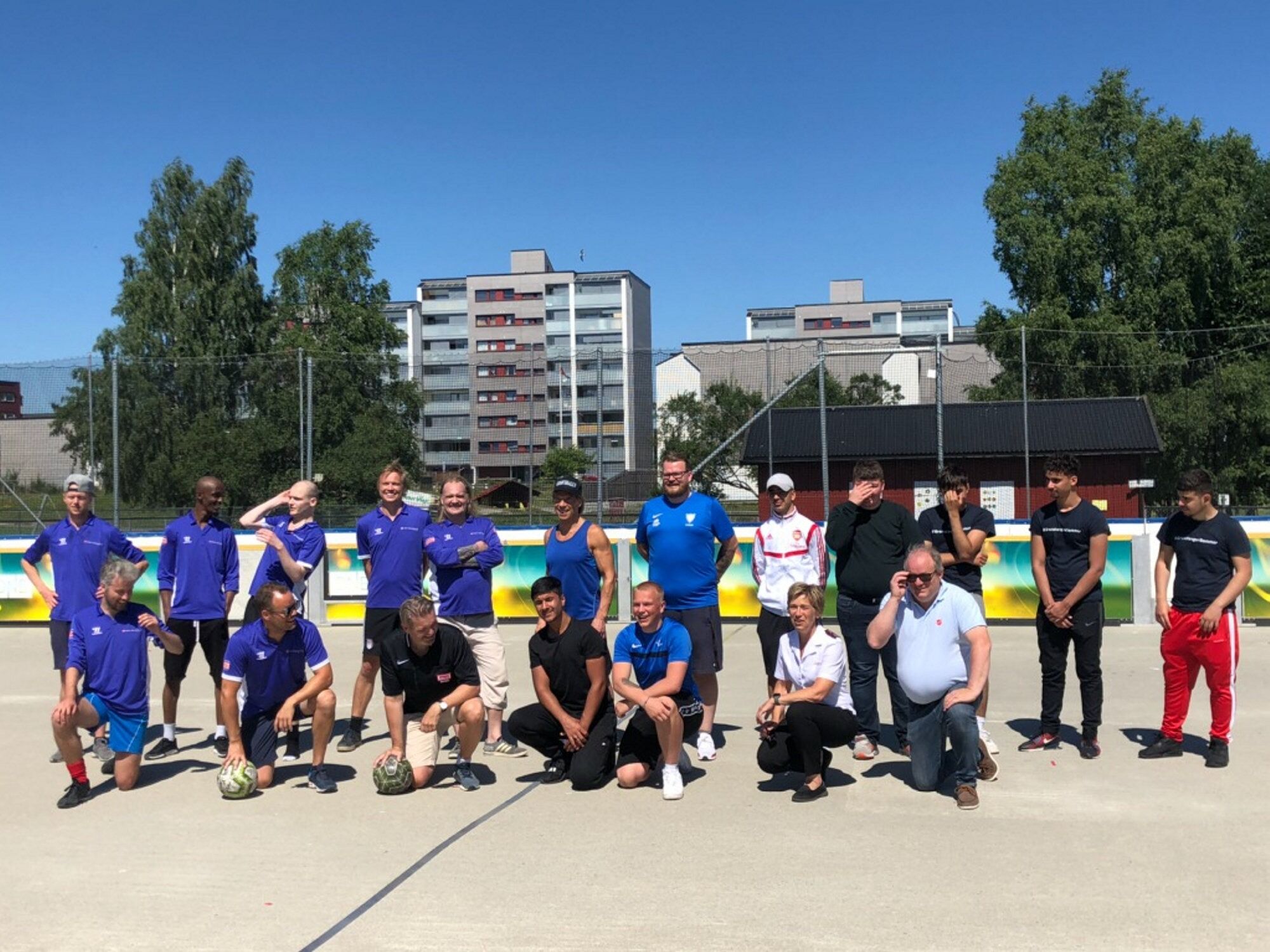 SAMLET TROPP: Frelsesarmeens Oslo-lag og et sammensatt lag fra Furuset spilte en uhøytidelig kamp i anledningen markeringen av samarbeidet mellom de to aktørene. Lagene stilte opp på bildet sammen med blant andre Jan Bøhler (seks fra venstre bak) som står ved siden av daglig leder i Furuset IF Fotball, Kent-Rune Grande. På kne foran i sort er Rune R. Isegran, nasjonal koordinator for Frelsesarmeens gatefotball, og Dion Tason, styreleder i Furuset IF Fotball. Ytterst til høyre ses virksomhetsleder Wenche Walderhaug Midjord, og regionleder sør Frode Woldsund, i Frelsesarmeens rusomsorg. Foto:Bilde 1 av 2