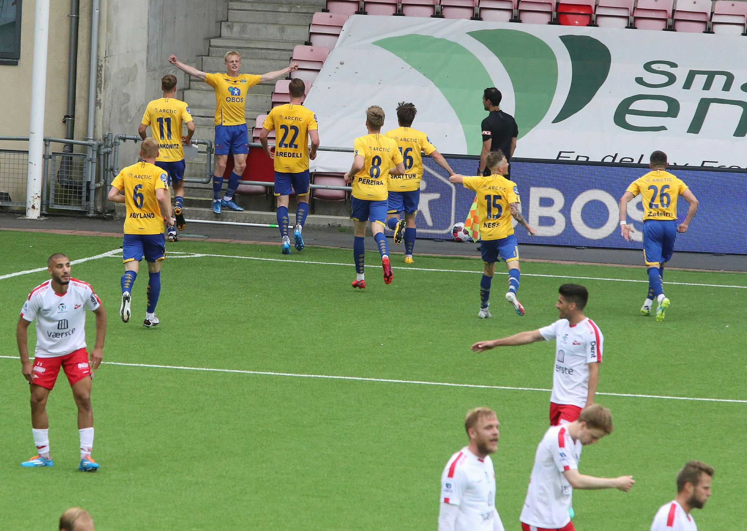 Groruds toppscorer Oscar Aga fornektet seg heller ikke borte mot Fredrikstad. Utligning på overtid - og da er det bare å strekke armene i været og vente på at lagkameratene kommer løpende for å hylle ham - mens spillerne fra plankebyen fortviler over to tapte poeng. Foto: Rolf E. WulffBilde 1 av 5