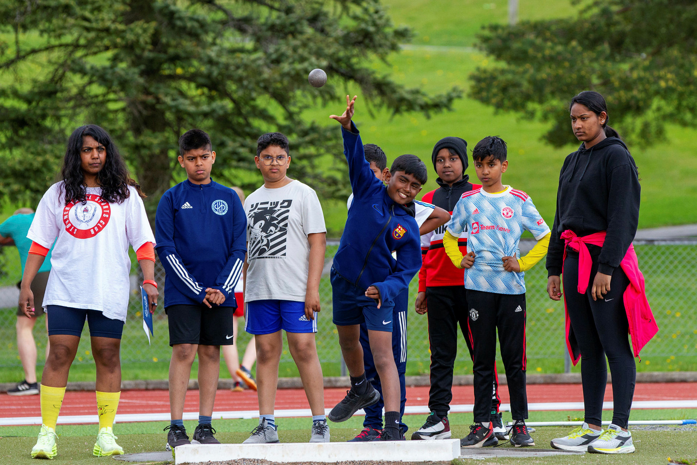 Medlemmer i Stovner Tamil Sports Club kaster kule – en av hovedaktivitetene under friidrettsstevnet på Stovner-banen sist søndag. Foto: Athithyan ValluvanBilde 1 av 4