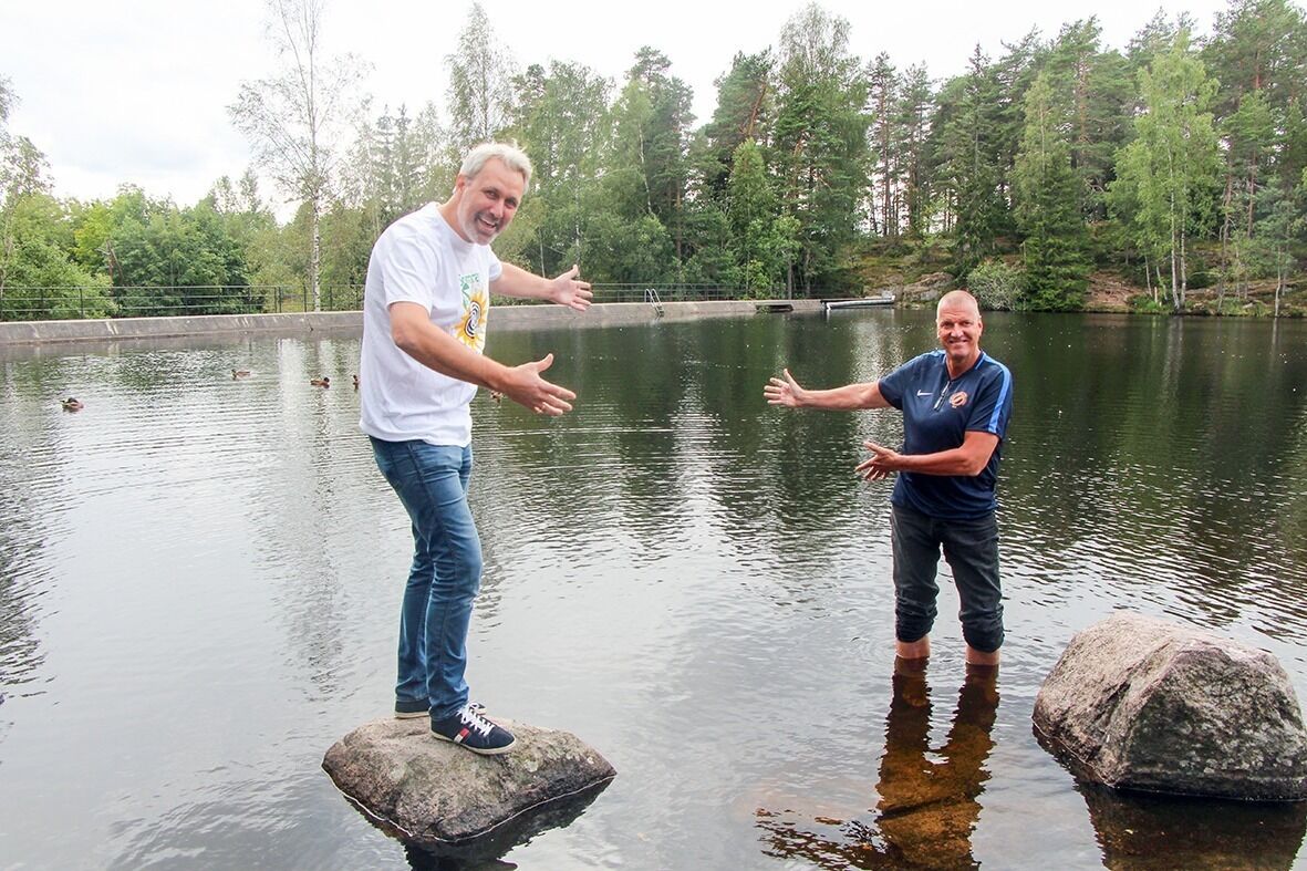 HER SKJER DET: Badedammen på Grorud er arena når Svømme- og aktivitetsdagen finner sted på lørdag fra klokka 12. Det blir anledning til å ta svømmeknappen, og det blir også kanopadling med Romsås-speiderne, kafé og sommerdart. Her er Øystein Kielland (t.v.) fra avisa og Kristian Austveg fra Svømmeklubben Speed. Foto:Bilde 1 av 1