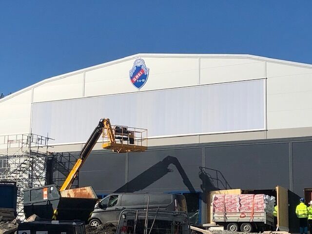 Arbeidet med SF Greis nye fotballhall går unna. Nå har man også fått smykket bygget med klubblogoen.